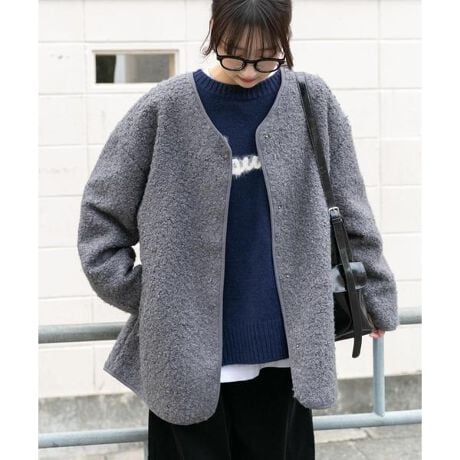 軽やかでふんわりとしたボア素材を使用したジャケットは、見た目にも暖かく、着心地も軽やか。丸みのあるリラックスシルエットが女性らしい柔らかな印象を与えます。首元はすっきりとしたノーカラーデザインで、インナーを選ばず着回し可能。ゆったりとしたオーバーサイズシルエットで、厚手ニットやスウェットの上からも快適に羽織れます。ミドル丈でボトムスとのバランスも取りやすく、カジュアルからきれいめまで幅広く活躍する一着です。