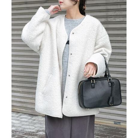 軽やかでふんわりとしたボア素材を使用したジャケットは、見た目にも暖かく、着心地も軽やか。丸みのあるリラックスシルエットが女性らしい柔らかな印象を与えます。首元はすっきりとしたノーカラーデザインで、インナーを選ばず着回し可能。ゆったりとしたオーバーサイズシルエットで、厚手ニットやスウェットの上からも快適に羽織れます。ミドル丈でボトムスとのバランスも取りやすく、カジュアルからきれいめまで幅広く活躍する一着です。