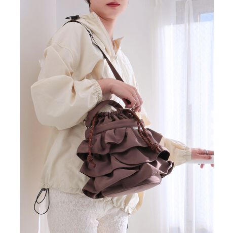 フリルが目を惹く巾着ショルダーバッグ