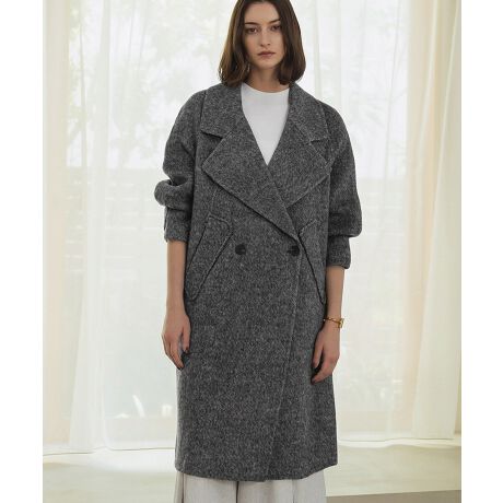 フロントはダブルブレスト仕様、大きめの襟と肩まわりに抜け感を持たせ、今っぽさをプラス。