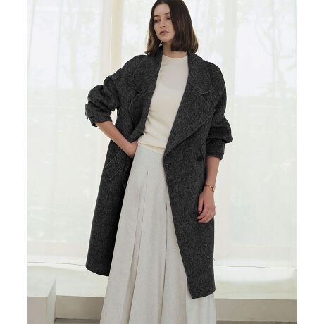 フロントはダブルブレスト仕様、大きめの襟と肩まわりに抜け感を持たせ、今っぽさをプラス。