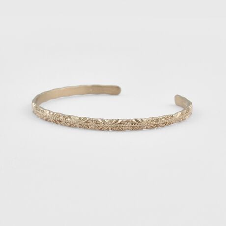 [型番:10254114864]シルバー板に植物の柄をデザインしたC型バングル。西洋のタイルや石柱に好んで使用された植物モチーフ模様。彫り模様の凹凸が、複雑な模様を繊細にみせます。ブラウンゴールドカラーのメッキをかけることで、柔らかさを加えました。