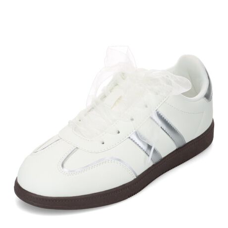 定番のクラシックなスポーツシューズを、大胆なリボンアレンジでフェミニン&モードに昇華させた一足。