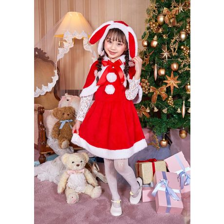 たれ耳と幅広のサテンリボン付きのケープは顔回りを華やかに見せてくれます。
