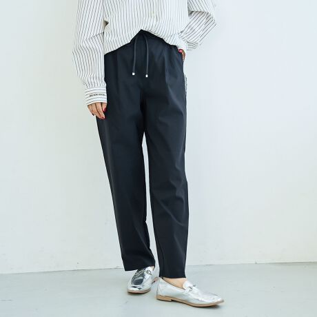 ワンタックと金具付きウエスト紐で、カジュアルすぎない印象に仕上げています。