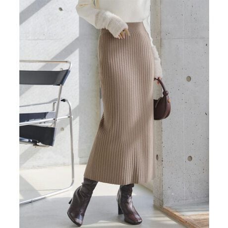 流行り関係なく幅広いテイストで着こなしていただける大人のリブニットスカートです。