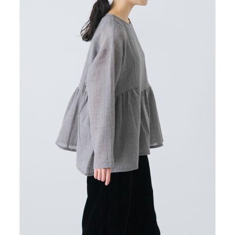 ウールガーゼ生地でブラウスをご用意しました。切り替え位置がフロントと両サイドで異なり、奥行きのあるデザインに仕上がっています。程よいボリューム感がふんわりとしたシルエットを生みウエストまわりをさり気なくカバー。冬でも着られるおすすめのトップスです。