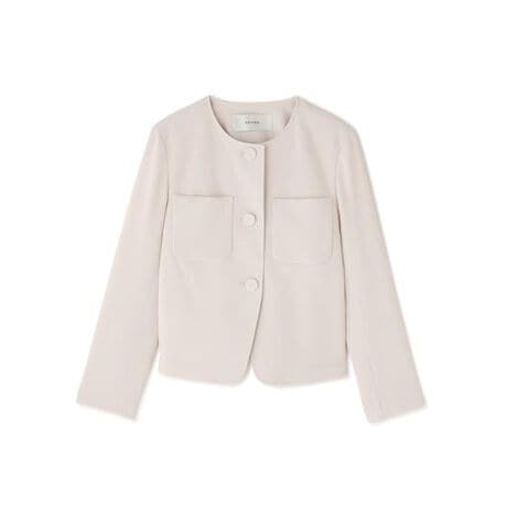 クルミボタンが特徴的なストレッチジョーゼットノーカラージャケット