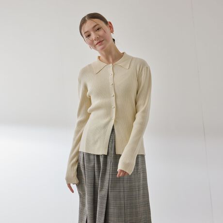 もちっとテクスチャーで伸縮性に優れる糸を使用した前開きデザインのポロ襟デザインのリブニットトップスです。