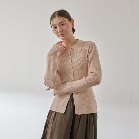 もちっとテクスチャーで伸縮性に優れる糸を使用した前開きデザインのポロ襟デザインのリブニットトップスです。