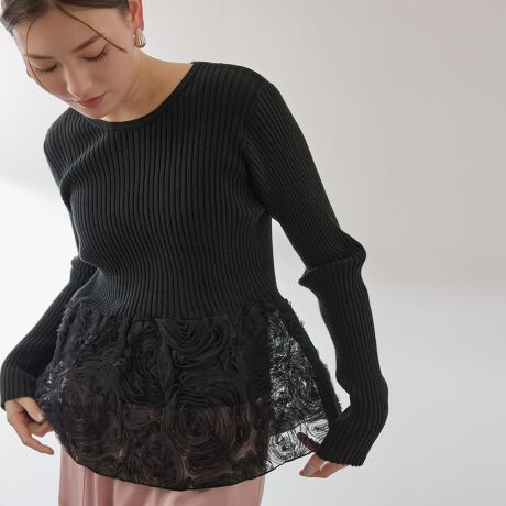 裾はふんだんにフラワーチュールをあしらって、ペプラムラインを描く華やぎニットプルオーバーです。