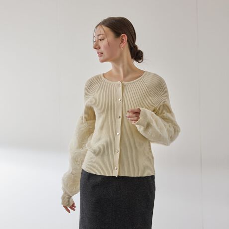 お袖にフラワーチュールをあしらった華やぎニットカーディガンです。