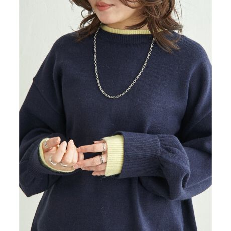 襟元と袖口にさりげなく効いた配色が、シンプルなニットに奥行きを生み、1枚で完成度の高いコーディネートへ。