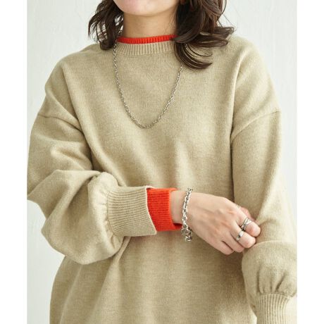 襟元と袖口にさりげなく効いた配色が、シンプルなニットに奥行きを生み、1枚で完成度の高いコーディネートへ。