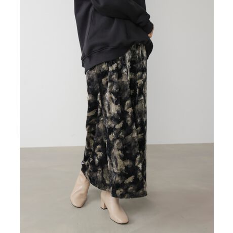 動くたびに表情が変わる、ニュアンス感のある柄が魅力の一枚。ベロアならではのマットなツヤが派手すぎず、いつものコーデをぐっとリッチに見せてくれます。落ち感のあるシルエットと後ろスリットで、自然に縦ラインを強調。ウエストは総ゴム仕様なので、きちんと感がありながらもストレスフリーなはき心地です。オンにもオフにも寄り添う、大人女子の頼れるスカート。