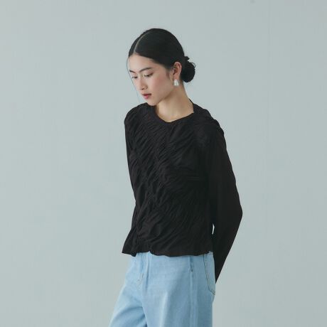 ボディに寄り添うシルエットですが、前身頃のたっぷりギャザーと後身頃ヨーク部分にもシャーリングが施されているので動きやすさも担保。