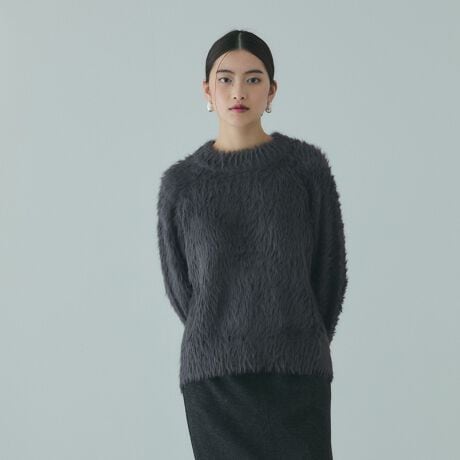思わず頬ずりしたくなるような柔らかさと軽やかな空気感をプラスする毛足のあるシャギーニット素材を使用しています。