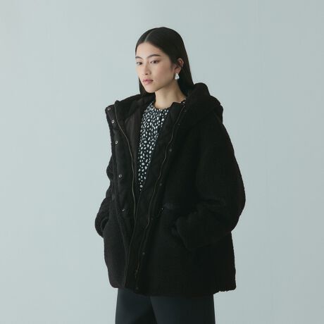 短めの毛足のシープ風ボア素材を使用したフーディブルゾンです。