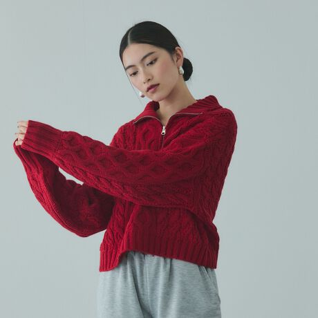 ダイヤ柄とケーブル編みの編地MIXデザインで、ウールのようなふっくらとした風合いを付与したバルキーニットプルオーバーです。