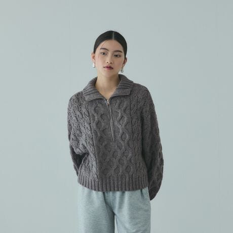 ダイヤ柄とケーブル編みの編地MIXデザインで、ウールのようなふっくらとした風合いを付与したバルキーニットプルオーバーです。