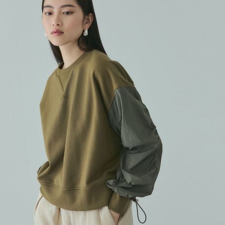 お袖をコットンナイロンのタイプライター素材で切り替え、タックを入れてカーヴィなラインを描くスリーブデザインがポイントのスウェットプルオーバーです。