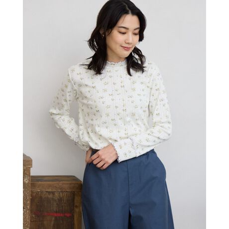 穴飾りで表現したレース調の編地の上に小花柄をプリントしたフェミニンなアイテム。