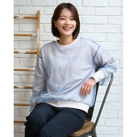 少し肩を落としたボクシー型のボディを包み込むようにチュールで飾ったデザインスウェットになっています。