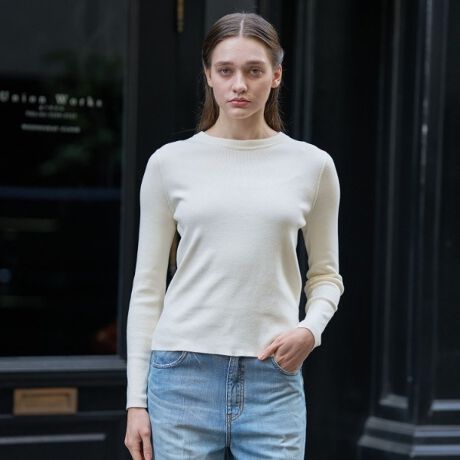 ●スッキリとコンパクトなサイズ感でありながら、身体のラインを拾いすぎない程よい肉感の編地で仕上げています。