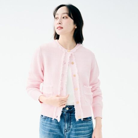 表面感ある編み地に施したフリンジが目を引くニットジャケット。
