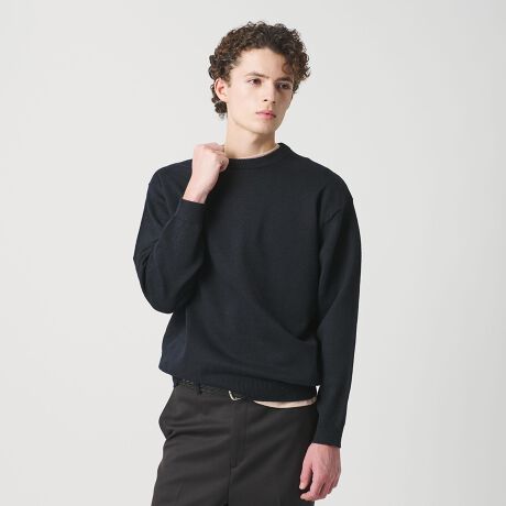 通常のクルーネックより太目の衿巾に設定し、モックネックほど高くはないものの存在感のあるクルーネックデザイン。