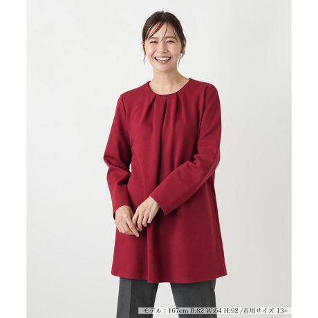 しなやかな肌触りと快適な着心地が魅力の、ノーカラーブラウス。アクリル、レーヨン、ナイロン、ポリウレタンをブレンドした、程よくストレッチ性のある素材です。ご自宅で手洗いできるウォッシャブル仕様で、日常のお手入れも簡単。ノーカラーの丸首デザインは、デコルテラインを美しく見せ、洗練された大人の女性の品格を演出いたします。シンプルな無地デザインなので、様々なインナーやボトムスと合わせやすく、着回し力も抜群です。一枚で着ても上品な存在感を放ち、冬のコーディネートに軽やかなアクセントと上品さを添える、着回し力の高い一枚です。