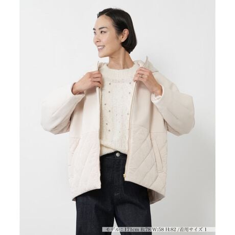 滑らかなタッチのジャージー素材と、中わた入りのダイヤキルティングをドッキングさせたジップアップ仕様のフーデッドショートコート。異素材のコントラストがワントーンの中に洗練された奥行きを演出します。さらにきらりと光るゴールドファスナーが、スポーティなデザインに大人の品格をプラス。暖かな中わた入りで、軽やかなショート丈はボリュームボトムスとも好相性。これからの季節のデイリールックをリッチに格上げしてくれるアウターです。