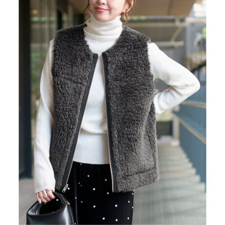 スエード面とボア側の全く違った素材のリバーシブル仕様で、気分によって様々な着こなしが楽しめます。大き過ぎずコンパクト気味なサイズ感のため着膨れの心配も少なく、さっと羽織るだけでアクセントになる冬まで着回しできるアイテムです。
