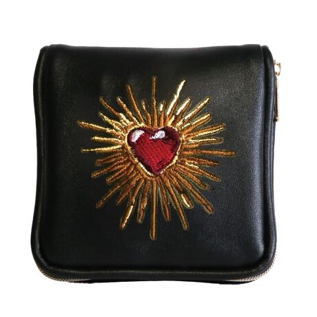 【お守り刺繍のポーチ】刺繍モチーフに意味が込められている、お守りのようなアクセサリーポーチ。【上品なスエード調】内側は柔らかく高級感ある生地を使用、大切なジュエリーを優しく守ってくれる〇【まとめて収納】指輪ホルダー、ピアスやネックレスの収納部の他に、小物が収納できるファスナーポケット付き◎【持ち運びやすい】手のひらサイズのコンパクト設計で、薄型だからバッグに入れても邪魔にならない◎