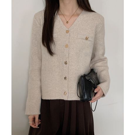 "かっちりきれいめにスタイルまとまるVネックのショート丈ニットカーディガン。