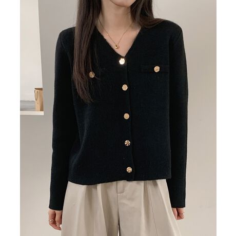 "かっちりきれいめにスタイルまとまるVネックのショート丈ニットカーディガン。
