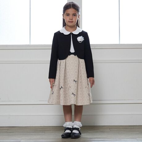 上品なジャガード素材のワンピースに散らされたリボンがガーリーな印象に。紺色のジャケットには襟付きで華やかさを演出。立体的なお花のコサージュが目を引きます。
