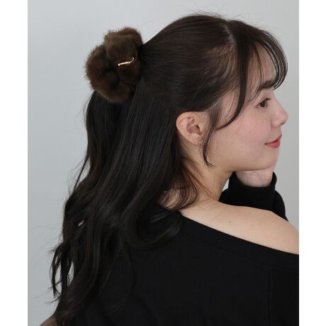 秋冬ムード高まるフェイクファーに高級感のあるメタルモチーフがあしらわれたシュシュ。