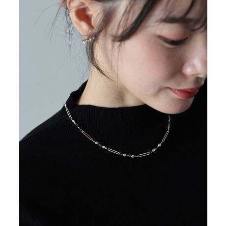 小ぶりなキュービックジルコニアとメタルバーが連なったチェーンネックレス。