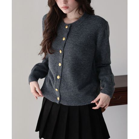 上品な金釦がアクセントになったクルーネックニットカーディガン。