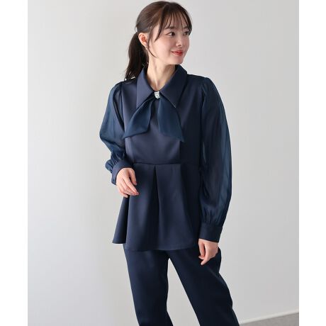 シャツ襟とパールモチーフのリボンタイできちんと感を演出します。