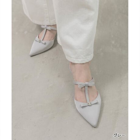 上品なミニリボンをあしらったTストラップデザインがポイントのミュールパンプス。
