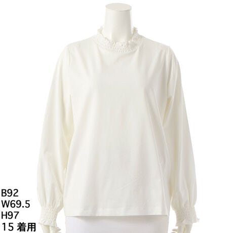 [型番:6702000]接触冷感の天竺生地を使用したデザインカットソー。衿と袖口のシャーリングがポイントです。6702100とのコーディネイトがお勧めです。シャツのインナーにして衿と袖口のフリルをチラ見せさせるのもGoodです。グリーンノート 大きいサイズ レディース ゆったり カットソー 長袖 接触冷感 インナー 6702000