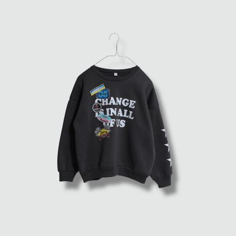 胸元には英字とワッペン風のプリント、左そでには星のプリントが可愛いデザインです。