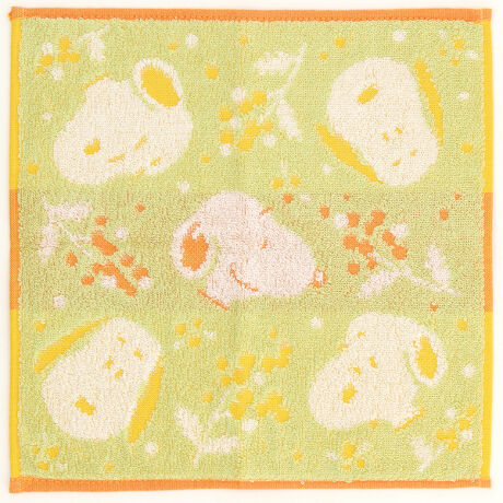 色々な表情のスヌーピーとミモザが散りばめられたタオルハンカチです。ブルーとグリーンのさわやかなカラーもポイント。