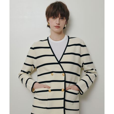 メタルのエンブレム釦が程よい華やぎを添え、アイボリーはブラックの配色パイピングでより洗練された印象に。