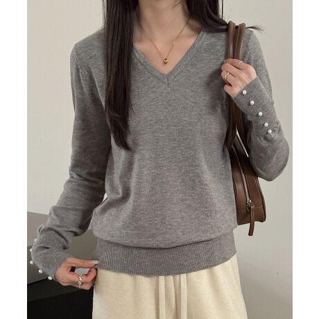 袖口は長めに取られたリブ切り替えが手首を細見せし、パールの飾りボタンが女性らしさをぐっと引き立てます。
