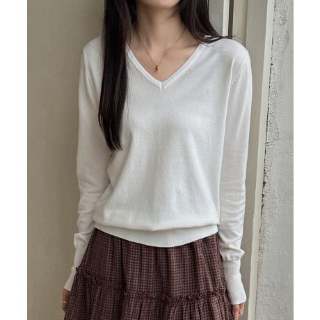 首元は深すぎない上品なVネックがデコルテをすっきり見せ、女性らしさを引き立てます。