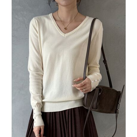 パールボタン付きVネックニットプルオーバー