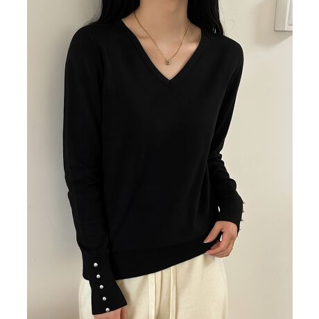袖口は長めに取られたリブ切り替えが手首を細見せし、パールの飾りボタンが女性らしさをぐっと引き立てます。
